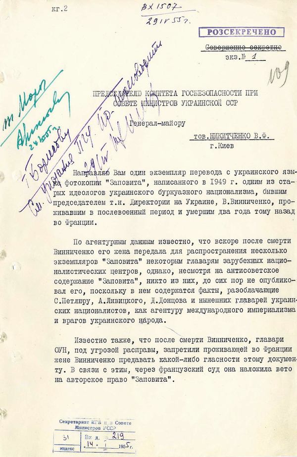 «За агентурними даними відомо, що невдовзі після смерті Винниченка дружина передала для поширення кілька примірників його «Заповіту» деяким лідерам закордонних націоналістичних центрів. Однак, незважаючи на антирадянський зміст «Заповіту», ніхто з них досі не опублікував його, оскільки в ньому містяться факти, які розвінчують С. Петлюру, А. Лівицького, Д. Донцова та нинішніх лідерів українських націоналістів, як агентуру імперіалізму і ворогів українського народу.