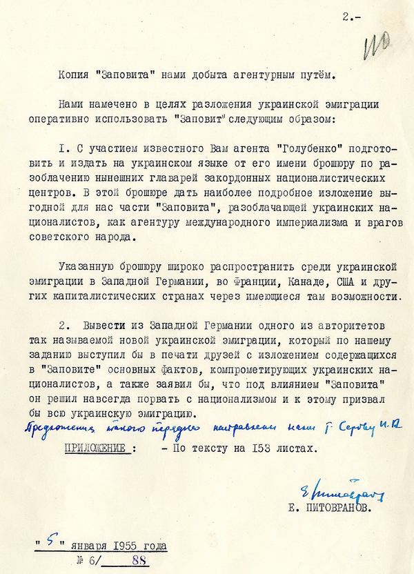 Нами намічено з метою розкладання української еміграції оперативно використати «Заповіт»…» (ГДА СЗР України. – Ф. 1. Спр. 6760. – Т. 1. – Арк. 109–110).
