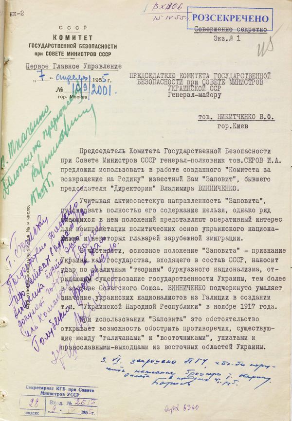 Одночасно Є. Пітовранов надіслав такого самого листа і копію «Заповіту» голові кгб при см ссср Івану Сєрову. Відтоді постать В. Винниченка і всі зібрані на нього матеріали знову опинилися в центрі уваги чекістів. Цього разу вони вирішили зіграти на певних протиріччях його політичних поглядів, непослідовності, амбіціях, розбіжностях з іншими діячами українського національно-визвольного руху, зокрема з Симоном Петлюрою.