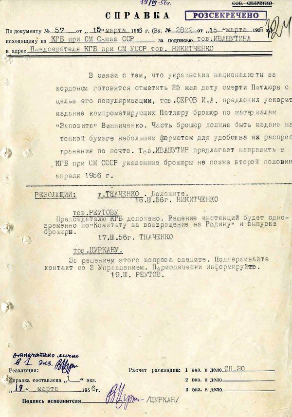 Зрештою знайшли форму подачі та інформаційний привід. У черговому листі з москви зазначали, що це має бути брошура під назвою «Винниченко про Петлюру». Її рекомендували написати до 30-річчя від дня убивства С. Петлюри, тобто до 25 травня 1956 року. І в той час, коли українська еміграція вшановуватиме Головного Отамана Армії УНР і другого голову Директорії УНР, висловлюваннями першого голови Директорії В. Винниченка спробувати його дискредитувати і применшити роль в українській історії. Частину накладу мали виготовити на тонкому папері невеликого формату, щоб зручно було розсилати в конвертах поштою в різні українські емігрантські осередки. Це планували робити під егідою «Комітету за повернення на батьківщину».