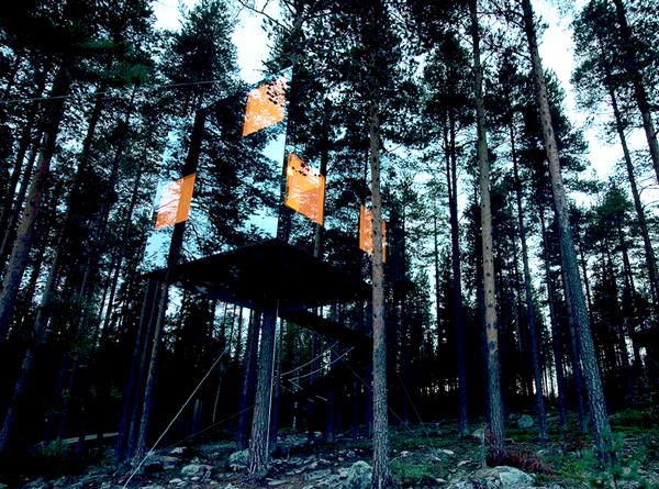 В зеркальном кубе, пристроившемся на деревьях в лесной глуши, отражается все, что его окружает: лесная глушь, поляна и небо, поэтому конструкцию размером 4х4х4 м человеческий глаз не сразу и заметит. А чтобы птицы не врезались, куб «укутан» инфракрасной пленкой, которую пернатые, в отличие от людей, видят. Весь интерьер из березовой фанеры. Кроме спальни для двоих имеются гостиная, ванная и даже терраса на крыше. В отеле есть и другие удивительные апартаменты: в виде НЛО, птичьего гнезда или стрекозы. Для удобства гостей на одном из деревьев сооружена сауна, рассчитанная на восьмерых.