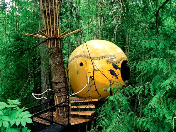 Те, кому посчастливилось провести пару ночей в этом отеле, называют его как минимум колыбелью для птиц. Гостевых номеров всего три. Это деревянные сферы, подвешенные на деревьях. Номер «Ева» рассчитан на 137 кг веса постояльцев. «Эрин» и «Мелоди» — просторные апартаменты с двуспальной кроватью и кроватью-чердаком. Каждая сфера оборудована холодильником и встроенными колонками, чтобы можно было запастись закусками и висеть меж деревьев под музыку. Удобства — в виде компостных и традиционных туалетов , а также душа и сауны — на улице. Гости в восторге.