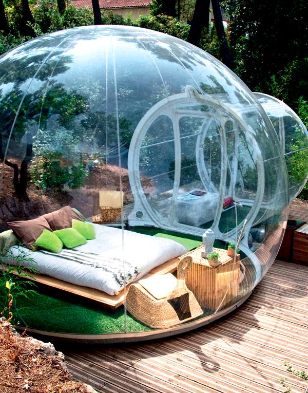 Провести ночь в сосновом бору, лежа на траве и наблюдая звездное небо, — счастье, доступное каждому. Вот только сырость и насекомые — обязательные атрибуты такой ночевки. Отдых в «палаточном лагере» в Монтаньяке-Монпеза лишен подобных недостатков. Здесь гости наслаждаются жизнью в пузырях из прозрачного эластичного материала, который днем не пропускает ультрафиолет, а ночью защищает от насекомых и сырости. Травяной пол и телескоп — приятные дополнения к комфорту. Форма пузырей поддерживается за счет свежего воздуха, нагнетаемого небольшим бесшумным устройством. Внутрь комнат ведут цилиндрические коридоры. По окончании сезона пузыри сдувают.