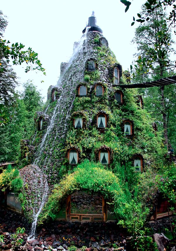 Волшебный горный домик сооружен в биологическом заповеднике Уило-Уило. Внешне отель выглядит как вулкан, поросший буйной растительностью и постоянно извергающий воду вместо лавы. Если бы не оконные проемы в несколько ярусов, то коническая конструкция выглядела бы как часть лесного пейзажа. «Обезьяний» подвесной мостик на уровне средней части сооружения — единственный способ попасть внутрь. Из некоторых окон открывается вид на настоящий вулкан Мочо-Чошу-Энко. Комнаты оборудованы ваннами, вырубленными в цельном куске дерева.