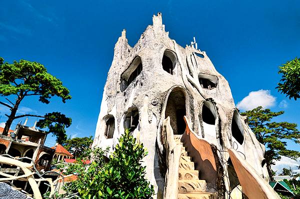 Гостевой дом Hang Nga, или, как его чаще называют, «Сумасшедший дом», напоминает огромное причудливое дерево. Ни одного угла — все стены округлые, лесенки закручиваются спиралью или перекинуты с одного корпуса на другой. Это смесь фантазий в стиле Гауди, «Алисы в Cтране чудес» и русских народных сказок. Ночью в комнатах спят постояльцы, а днем по дереву «путешествуют» экскурсанты.