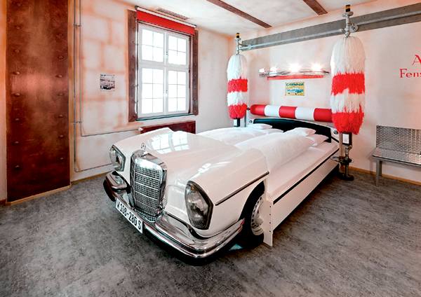 Гостиница для любителей авто. И в архитектуре здания, и в дизайне доминирует соответствующая тематика. В оформлении номеров используются элементы и запчасти автомобилей, а также раритетные средства передвижения целиком. Можно поспать на кровати-кадиллаке, укрыться в спальне-гараже, развалиться на диване-капоте, переночевать на «автомойке» — в одном из 10 тематических номеров. Кроме того, в отеле можно заняться «бодитюнингом» в салоне массажа и хорошо заправиться в местном гастрономическом ресторане.