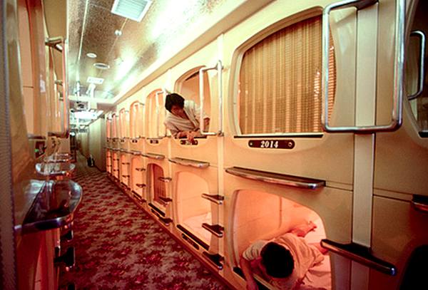 «Капсульный» отель, напоминающий подводную лодку или космический корабль. Комнаты — «норки» размером 2х1х1 м. Японцы называют их «гробами улучшенной планировки». Только для мужчин.