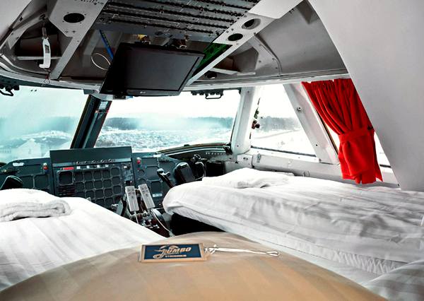 Боинг 747–212B (Jumbo Jet), принадлежавший обанкротившейся в 2002 году шведской компании, в 2008-м переделали в хостел и поставили у въезда в стокгольмский аэропорт Арланда. Интерьер был полностью демонтирован, салон продезинфицирован. В нем оборудовали 29 комнат. Площадь стандартного номера — 6 м2. Самый дорогой и просторный располагается в кабине пилотов. Там есть даже туалет. Для остальных гостей удобства в коридоре. Из кабины пилотов открывается панорамный вид на аэропорт, из обычных номеров — вид на взлетную полосу. В каждой комнате — телевизор, можно следить за расписанием рейсов. В отеле есть кафе и сувенирная лавка.