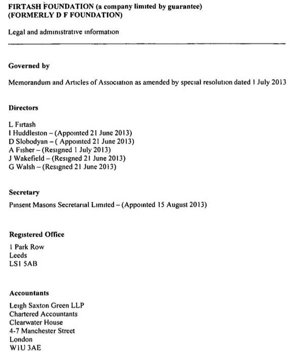 Для отмывания собственной репутации в Великобритании Фирташ создал организацию под названием «DF Foundation», которая недавно сменила название на «Firtash Foundation». Адресом регистрации этой структуры указан город Лидс, а ее руководительницей является жена олигарха — гражданка России Лада Фирташ.