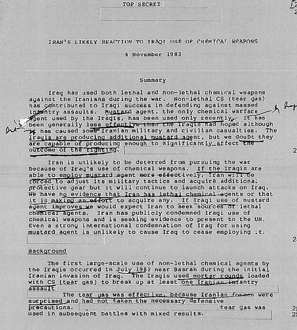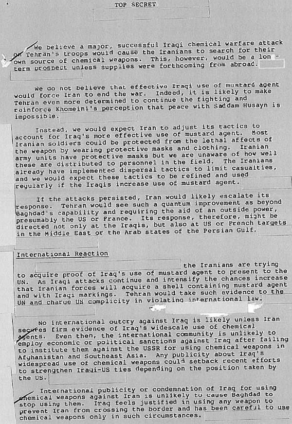 О да. Волновало. Вот что можно найти в тогдашних бумагах ЦРУ (см. рассекреченный документ от ноября 1983 года): «По мере продолжения иракских атак возрастает вероятность получения иранскими силами снарядов с ипритом и иракскими маркировками. Тегеран предоставит такие свидетельства ООН и обвинит США в соучастии нарушению международных законов».