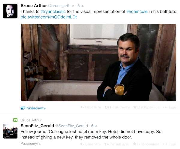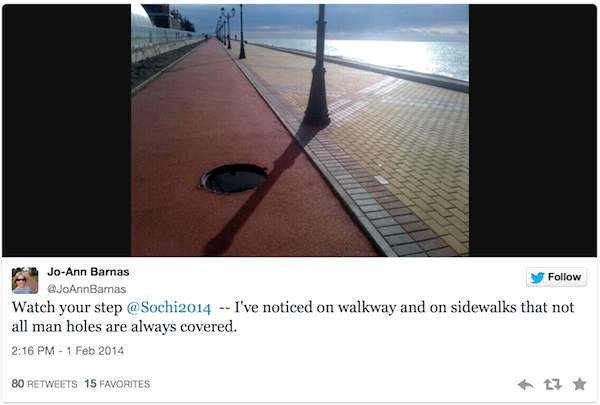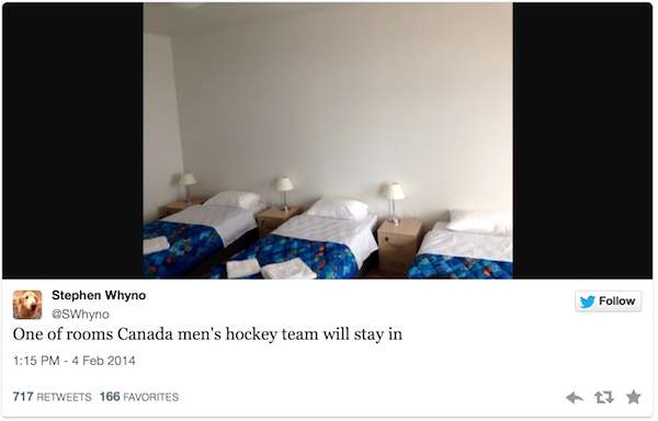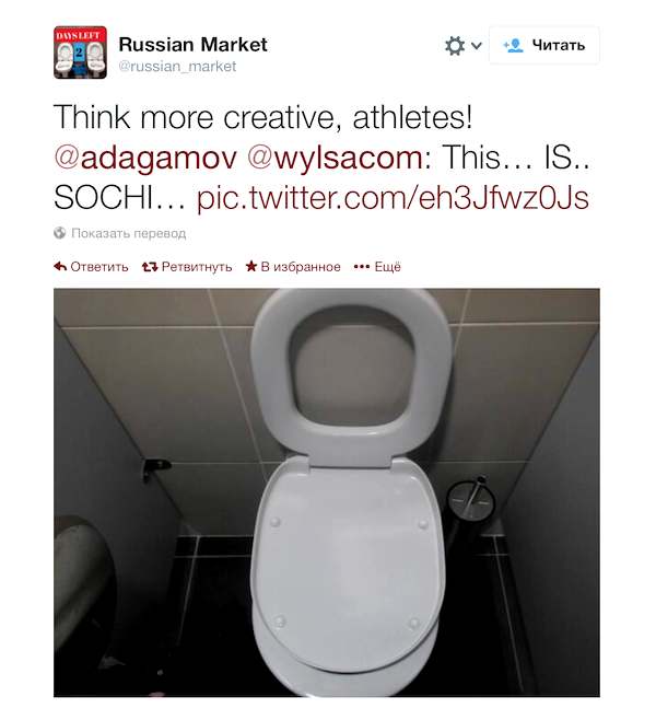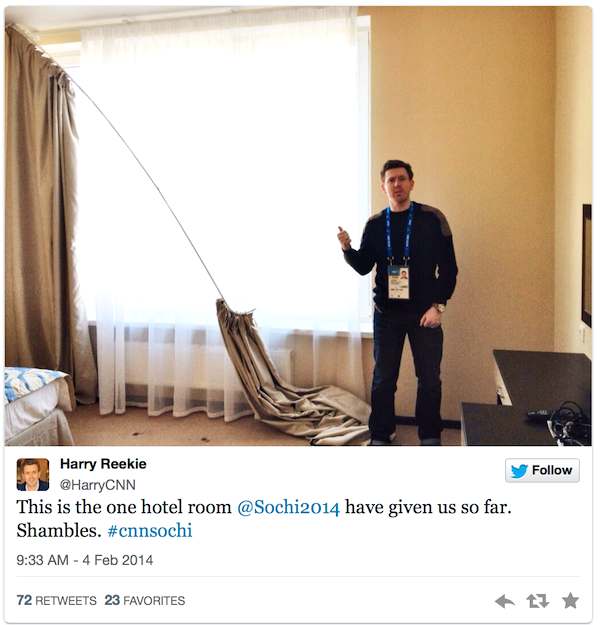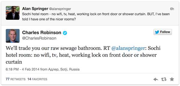 "Скучаю по тебе, горячая вода в моем отеле! Ты была лучшей", - саркастически отозвался о качестве своей гостиницы колумнист National Post Брюс Артур. Его коллеги из Globe and Mail Табата Саути написала Артуру: "Смотрю на эти фото ужасных сочинских отелей и думаю: "Знаешь, чего тебе нужно, Россия? Еще больше геев"".