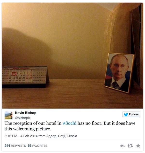 Продюсеру CTV Розе Хван тоже не повезло: в ее отеле нет воды. А вот на ресепшене в гостинице, где остановился Кевин Бишоп из BBC, нет пола, зато там успели поставить "симпатичную фотографию" (на ней изображен президент Владимир Путин).