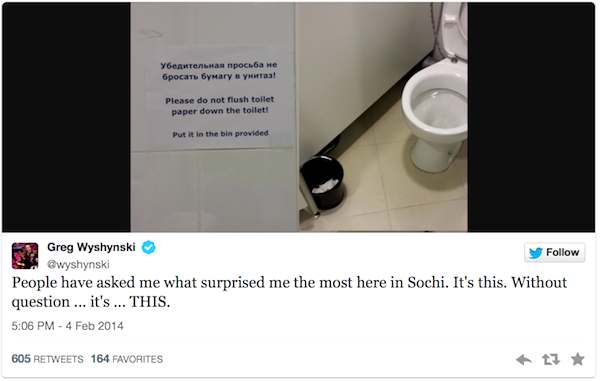 "Люди спрашивают меня, что удивило меня больше всего здесь. Несомненно, ЭТО", - написал Грег Вишнински из Yahoo! Sports, выложив фото из туалета отеля. На двери в уборную висит объявление: "Убедительная просьба не бросать бумагу в унитаз".