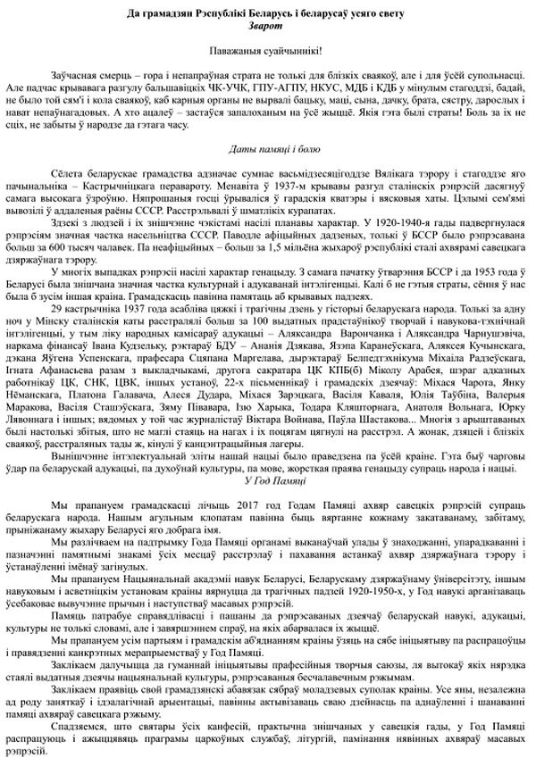 «Мы предлагаем общественности считать 2017 год Годом Памяти жертв советских репрессий против белорусского народа. Нашей общей заботой должно быть возвращение каждому замученному, убитому, униженному жителю Беларуси его доброго имени.»