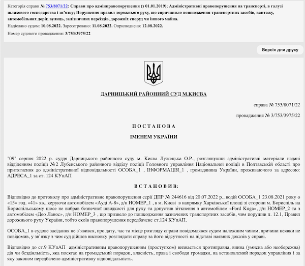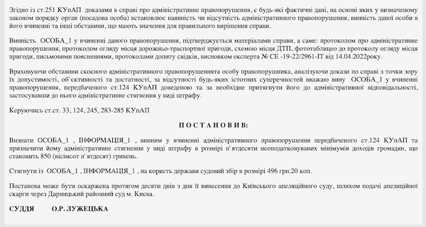 Тож суддя визнала Віктора Склему винним у порушенні правил дорожнього руху, що спричинило пошкодження транспортних засобів чи іншого майна (ст. 124 КУпАП). У якості адміністративного стягнення йому призначили 850 грн штрафу.