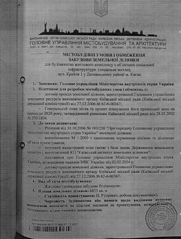 2. За 3 недели до завершения аренды, 07.12.2011 Управление градостроительства и архитектуры КГГА вопреки положениям Генплана Киева выдает ГУ МВД градостроительные условия и ограничения (ГУО) для строительства жилого комплекса с объектами социальной инфраструктуры (социальное жилье).