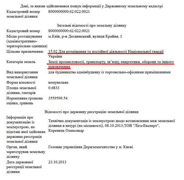 3. 23.10.2013 неожиданный выбрык. Земля удивительным образом становится государственной. Главное управление Госземагентства в г. Киеве проводит регистрацию земельного участка 8000000000:62:022:0021 с целевым назначением «для размещения и постоянной деятельности внутренних войск МВД - код 15.02»: