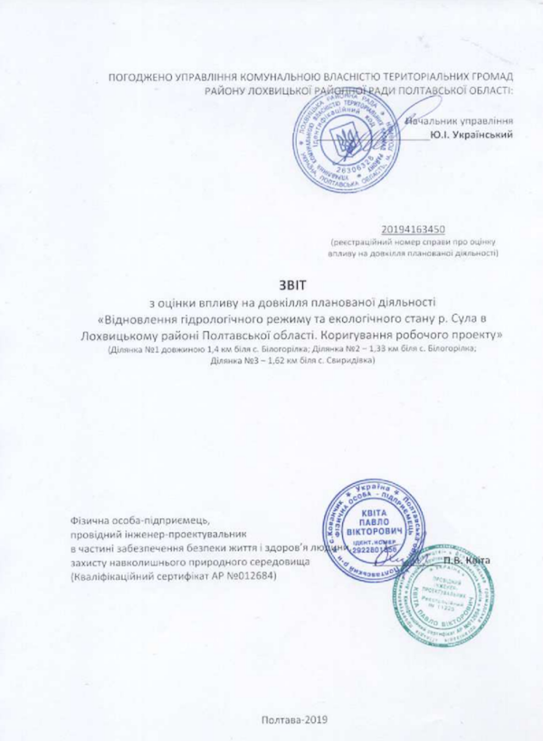 Весной 2019 года в СМИ Лохвицкого района Полтавской области появилось сообщение о планируемой деятельности с наукообразным названием - «Восстановление гидрологического режима и экологического состояния р. Сула в Лохвицком районе Полтавской области. Корректировка рабочего проекта». В нем извещалось о «восстановлении водности русла р. Сула в районе сел Билогорилка и т. н. “староречья” в районе с. Свиридовка - без подробностей. В реестре Минприроды оно было зарегистрировано 16.04.2019 под номером 20194163450 - в самый разгар президентской избирательной кампании.