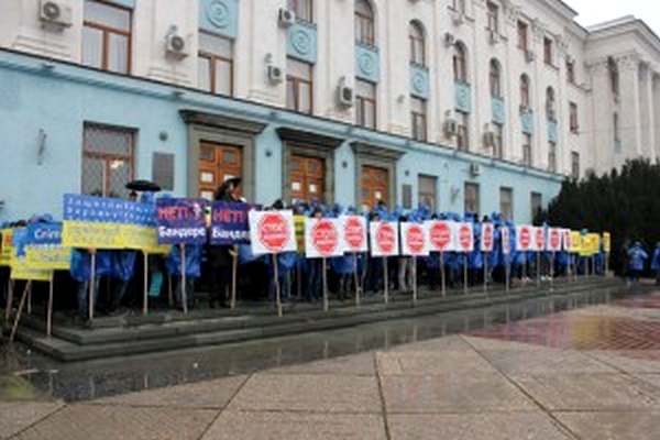 Эти же незабываемые лица сторонников власти были замечены и на митинге, организованном партией «Русское единство» и регионалами на площади Ленина в противовес митингу Меджлиса 28 января. Но там уже они просто выполняли роль массовки. Во-первых, глушить было некого – Меджлис перенес митинг с площади Ленина к представительству президента. А во-вторых, эта функция была у движения «Стоп-майдан», участники которого собрались под Совмином в голубых дождевиках с надписью «Янукович – наш президент».