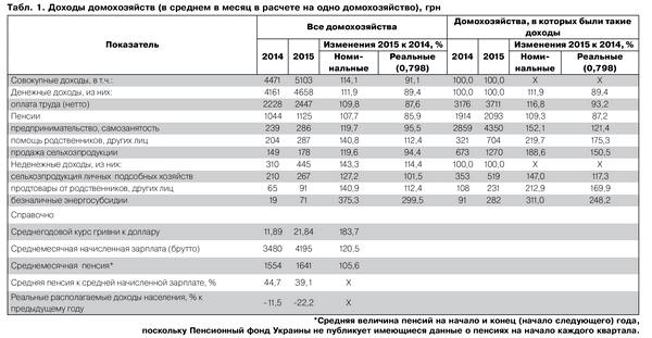 Совокупные доходы, помимо денежных, включают и неденежные (8,3% в 2015 г.), то есть натуральные и "условные" (безналичные субсидии и льготы) доходы в стоимостной оценке. Это потребленные сельхозпродукты с личных подсобных хозяйств (овощи, фрукты, мясомолочные продукты) и самозаготовки (грибы, лесные ягоды); продукты, полученные от родственников и других лиц. Продукты из личных подсобных хозяйств используют в основном сельские жители и в меньшей мере жители небольших городов. В целом по Украине продукты из личных подсобных хозяйств использовали 51,8% домохозяйств. А получали безвозмездно такие продукты преимущественно от родственников 39,6% домохозяйств в основном в крупных городах. А вот безналичные энергосубсидии получали (в основном в городах) пока еще 21,7% домохозяйств, но в этом году их доля существенно возрастет. И их средняя величина из-за резкого роста энерготарифов повысилась за год более чем втрое — с 91 грн в месяц в 2014 г. до 282 грн в 2015 г. И понятно, что их величина была более высокой в отопительный сезон: 205 грн в месяц в первом квартале, 140 — во втором, 102 — в третьем и уже по новым тарифам — 679 грн в четвертом (в четвертом квартале 2014-го почти в пять раз меньше – 138 грн).