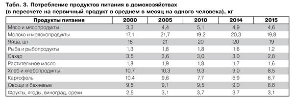 Применительно к продуктам питания целесообразно вместо оперирования денежными показателями привести данные об их потреблении в натуре. В 2015 г., как показано в табл. 3, потребление всех продуктов питания по сравнению с предыдущим годом сократилось. Особенно внушительно сокращение по рыбе и рыбопродуктам, преимущественно импортным, по которым среднегодовой ИПЦ особенно вырос (160,9%, по сравнению с 145,9% по всем продуктам питания и безалкогольным напиткам), а также фруктам, ягодам, винограду, где также велика импортируемая часть (172,4%).