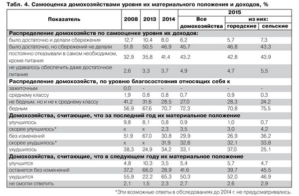 В рамках обследования условий жизни домохозяйств Госстат проводит ежегодные выборочные обследования самооценки уровня доходов. Последнее обследование проводилось в январе 2016 г., и его итоги опубликованы в конце июня. Данные основываются на субъективных определениях — достаточно ли получаемых доходов для удовлетворения основных потребностей и ряда других близких к этому показателей. Основные итоги последнего обследования приведены в табл. 4.