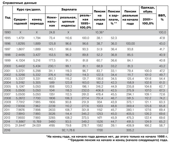 При такой повально неблагоприятной динамике самооценок населения куда оптимистичнее выглядят официальные показатели реальной зарплаты, пенсий и располагаемых доходов. Они определяются по динамике этих показателей в текущих ценах, скорректированных на индексы потребительских цен, правдивость которых вызывает немалые сомнения. По ним, например, выходит, что самая высокая реальная зарплата была в 2013 г., превышая реальные показатели 1995 г. в 3,73 раза, а по реальным пенсиям еще больше — аж в 4,91 раза. В 2015-м с падением экономики за эти два года рост оказывается поменьше — 2,79 раза по реальной зарплате и 3,05 раза по реальным пенсиям. Это значит, что в 1995-м они были во столько же раз ниже незавидного нынешнего уровня. Можно добавить, что по статистике реальная зарплата штатных работников в 2015 г. была вроде бы даже на 0,5% выше, чем в наиболее благоприятном 2008 г. Может, за пределами Украины кто-то и поверит этим цифрам и будет даже завидовать и восхищаться ими. Но у нас в стране верить в реальность этого многократного роста вряд ли кто отважится. Давайте мысленно перенесемся на 20 лет назад, попробовав представить и осмыслить, что тогда жизненный уровень работающих и пенсионеров был еще в четыре-пять раз ниже, чем незавидный нынешний.