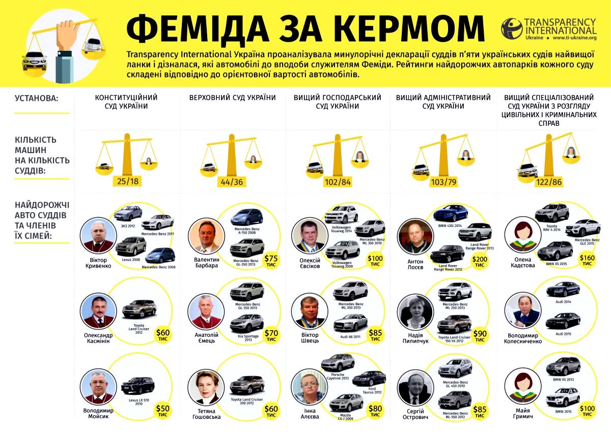 Тransparency International Украина презентовала результаты исследования деклараций судей высшей инстанции за прошлый год. Исследовались автопарки - как ежедневный пример стиля жизни судей, и подарки (призы, выигрыши) - довольно нетипичный и показательный источник прибыли.
