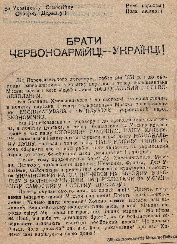 Листовка призывает красноармейцев вливаться в ряды УПА. По данным учетных карточек военной округи «Богун», 16% воинов перед вступлением в ряды УПА уже имели военный опыт в Красной армии. Листовка из архива ЦДВР