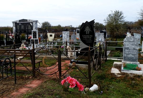 На соседней с Аметовыми могиле сидит прижавшись к памятнику небольшая желтая собака. Она встречает нас лаем, охраняя своего мертвого хозяина.