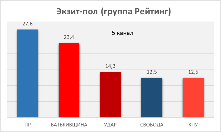 В экзит-поле «УКРАИНА - 2012», проведенного Социологической группой «Рейтинг» по заказу 5 канала в день выборов в Верховную Раду Украины были опрошены 23 тыс. человек на 350 участках.