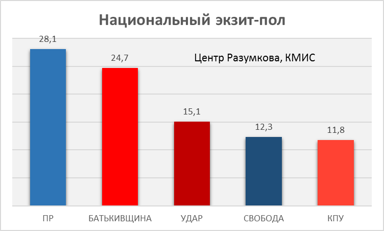 Предварительные исследования проводили несколько социологических служб. По данным Национального экзит-пола, Партия регионов на выборах набрала 28,1% голосов. Второе место занимает ОО «Батькивщина» с результатом в 24,7%, на третьем УДАР Виталия Кличко - 15,1%. Также, в Верховную Раду проходят Всеукраинское объединение Свобода - 12,3% и Коммунистическая партия Украины - 11,8%. Скандальный проект Натальи Королевской «Украина - Вперед», не преодолел пятипроцентный барьер, набрав 1,6% голосов.