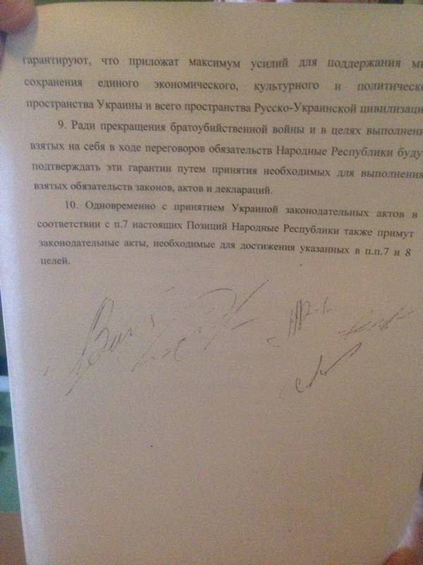 Василь Вовк показал редакции копию итоговых переговорных позиций «днр» и «лнр» от 1 сентября 2014 года , подписанных Захарченко, Пургиным, Плотницким, Карякиным и Цыпкаловым, которые ранее нигде не публиковались. Фотографии, сделанные на телефон, журналистом издания Hubs.