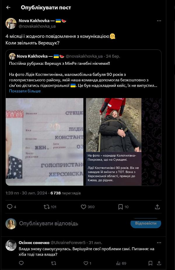 Сама Верещук теж все читає і повністю ігнорує. Наші люди до неї навіть підходили на різних зустрічах, питали: а може, ви якось відповісте, може якась буде реакція? Ні, ігнор повний. Позиція влади така: офіційно вони не працюють з окупацією. Це дуже зручно – офіційно відхреститися від тисяч людей, які вірять, залишаються там і чекають. А неофіційно в них, мабуть, мізків не вистачає, сміливості політичної та людської. Їм байдуже.