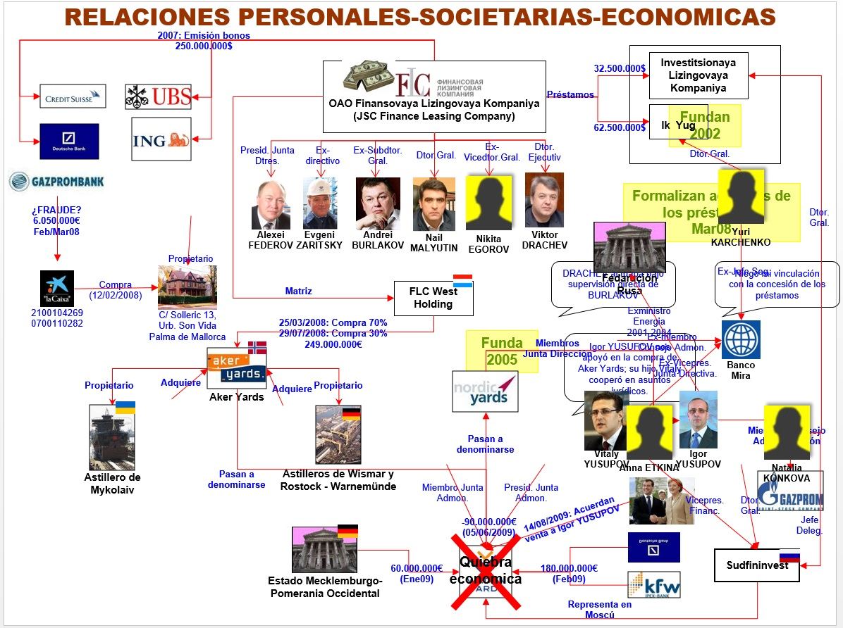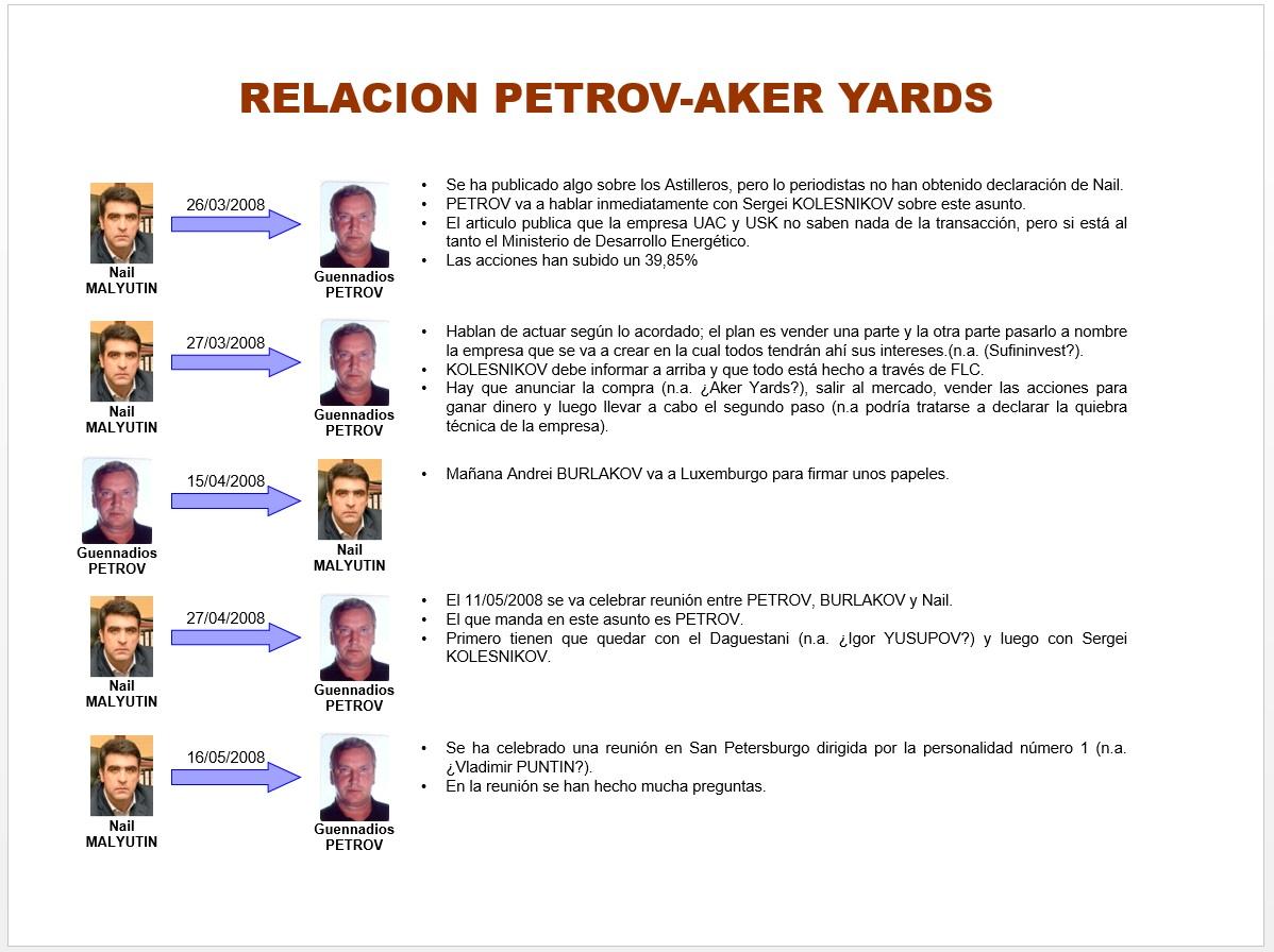 Согласно презентации, которую продемонстрировало следствие на суде, 11 мая 2008 года Бурлаков, Малютин и Петров лично встретились для обсуждения покупки верфей. 25 мая 2008 года Петров и Малютин обсудили по телефону, что Бурлаков встретится с Медведевым напрямую для обсуждения сделки. После этого Бурлаков договаривается о встрече с Петровым. 16 мая 2008 года Малютин и Петров обсуждают некую встречу с «номером первым». Испанское следствие предполагает, что речь идет о Владимире Путине. Позже в суде слушается разговор Наиля Малютина с Петровым: «Я с Сергеем связь держу, все нормально по кораблям, Верхний сказал, хорошо подумает».