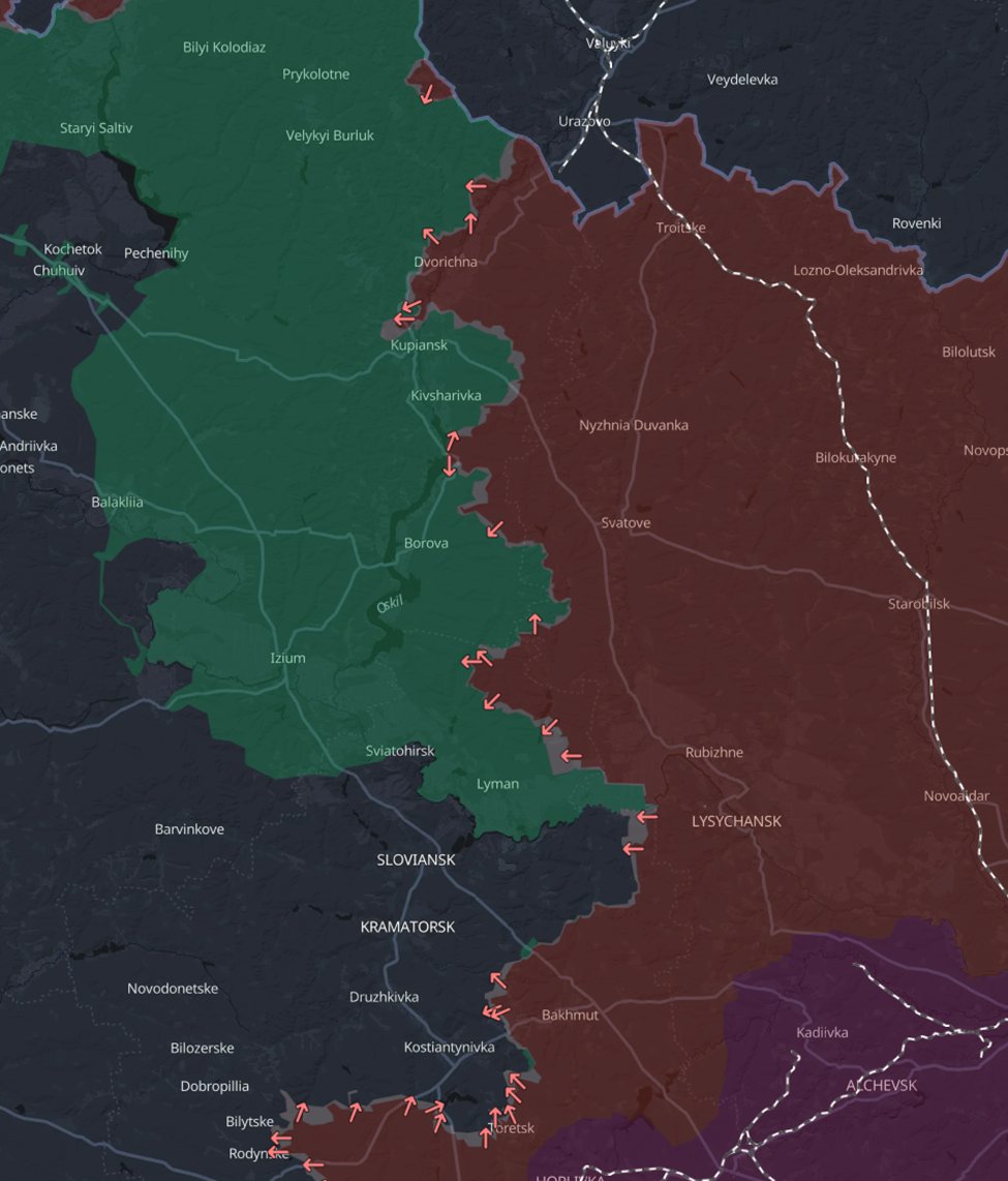 Російські підрозділи також намагаються розтягнути сили ЗСУ спробами просування в Запорізькій області вздовж річки Дніпро. Російські сили повільно просуваються біля Купянська та на схід від річки Оскіл.