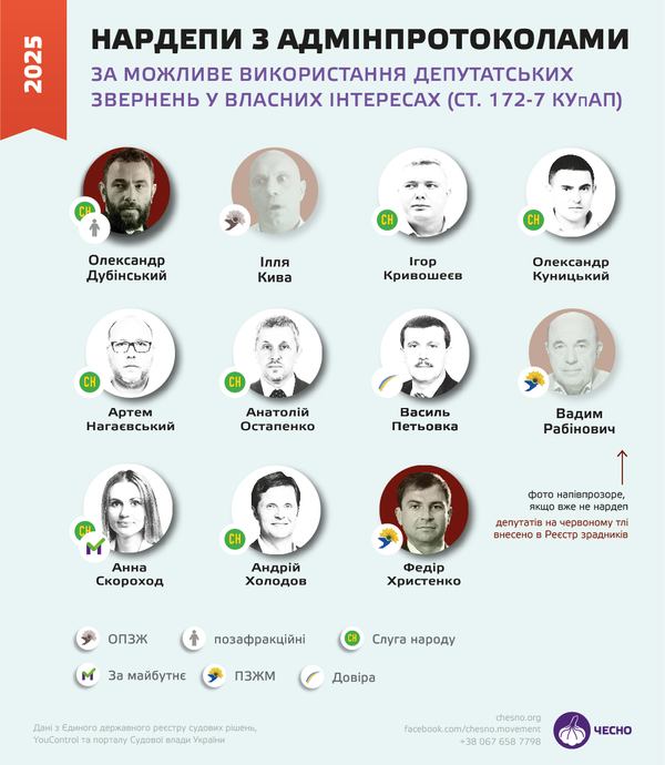 Також протоколи склали на нардепів Ігоря Кривошеєва та Анну Скороход через їх звернення. Єдиним джерелом інформації про це є судові постанови, але там лише в загальних рисах вказується, що парламентарії відправляли звернення, на думку правоохоронців, у власних інтересах.