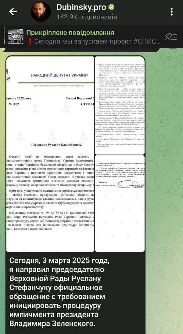 А нещодавно підозрюваний у держзраді Дубінський звернувся до голови Верховної Ради з вимогою ініціювати процедуру імпічменту Володимира Зеленського. Підставою для такої ініціативи нардепа буцімто став конфлікт президента України з президентом США Дональдом Трампом під час пресконференції 28 лютого цього року.
