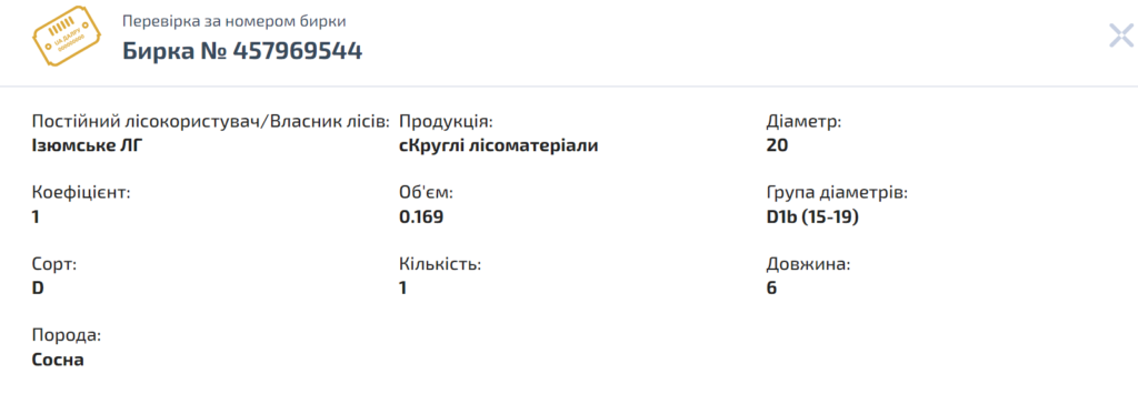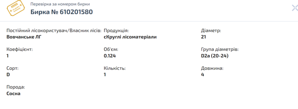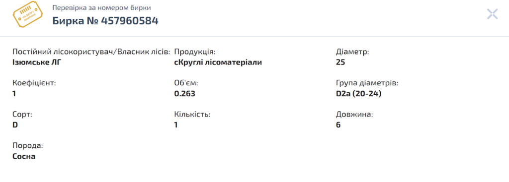 Ось приклад перевірки легальності деревини однієї з бирок, яку правоохоронці вилучили якраз на харківських фортифікаціях.