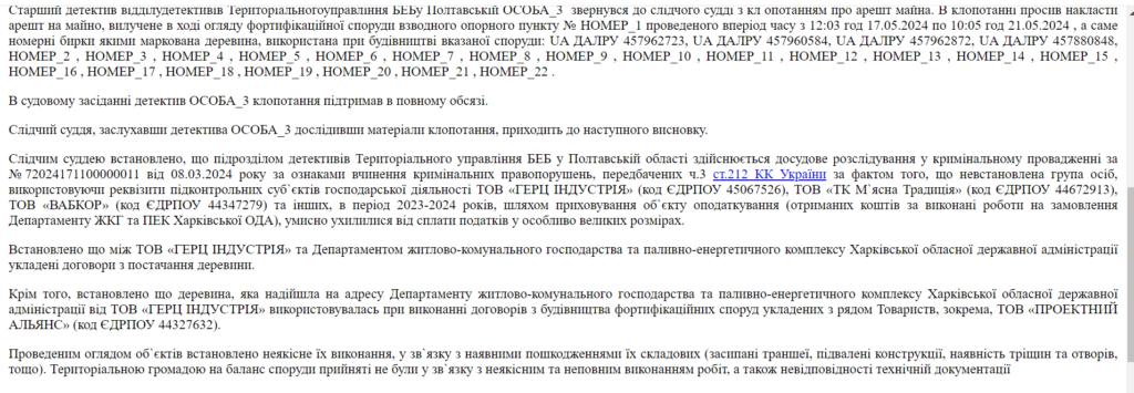 З ухвали суду про несплату податків та привласнення майна шляхом зловживання службовим становищем стало відомо, що деревина яка надійшла на адресу Департаменту житлово-комунального господарства та паливно-енергетичного комплексу Харківської обласної державної адміністрації від ТОВ «Герц Індустрія» використовувалась при виконанні договорів з будівництва фортифікаційних споруд укладених з рядом Товариств, зокрема, ТОВ «Проектний Альянс», ПАТ «Трест Житлобуд -1», ТДВ «Житлобуд-2».