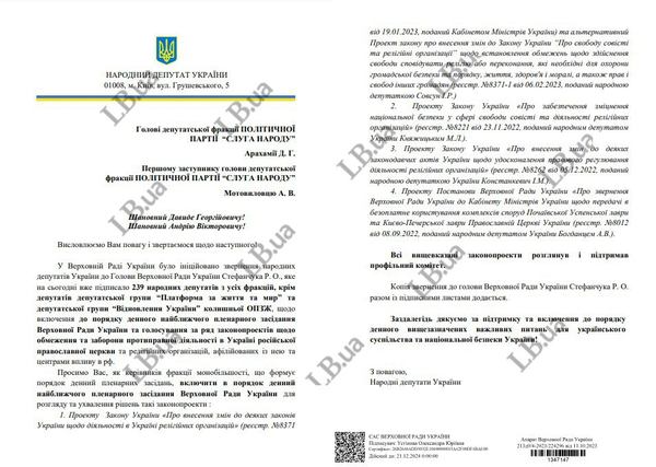 “Це питання мав би вирішити парламент попереднього скликання, і тоді зараз СБУ не ловила б по країні агентів ФСБ у рясах, які мають не просто ворожу пропагандистську літературу, а навіть сухпайки для ворожої армії. Нам треба унеможливити вплив ворога на свідомість українців. І ці законопроєкти покликані викорінити вплив російських спецслужб через мережу, вмонтовану в релігійні організації. Президент просив парламент підтримати урядовий проєкт, і фракція “Слуги народу” засвідчила своїми підписами, що це питання й ініціативу президента підтримує. Тепер її треба винести в порядок денний тоді, коли є найбільше нардепів у залі”.