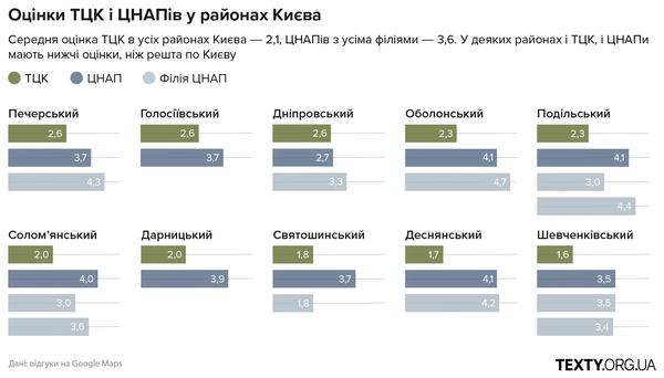 Ми порівняли відгуки відвідувачів ТЦК і київських центрів надання адміністративних послуг. Середній бал ТЦК в усіх районах Києва — 2,1, а ЦНАПів з усіма філіями — 3,6 (ще не ідеально, але вісім ЦНАПів мають оцінку чотири і вище, у той час як жоден ТЦК такої оцінки не досягнув).