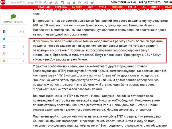 «Проблемы в [госкорпорации] Укроборонпроме? Бегут к Кононенко. Проблемы в министерстве? Бегут к Кононенко. Прокуратура, СБУ? Бегут к Кононенко», — говорил изданию «Новое время» Виктор Чумак, депутат покинувший ряды президентской фракции.