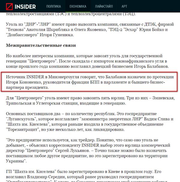 Влияние Кононенко на «Центрэнерго» — единственной генерирующей компании, которая осталась в госсобственности, — известно давно. Издание Insider описывало «угольные» схемы, по которым тогдашний директор «Центрэнерго» Игорь Балабанов и Игорь Кононенко организовали поставки угля из ОРДЛО.