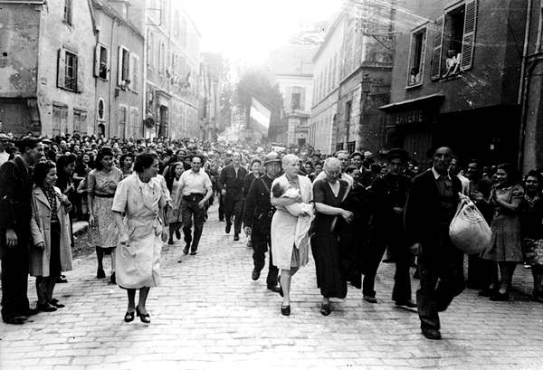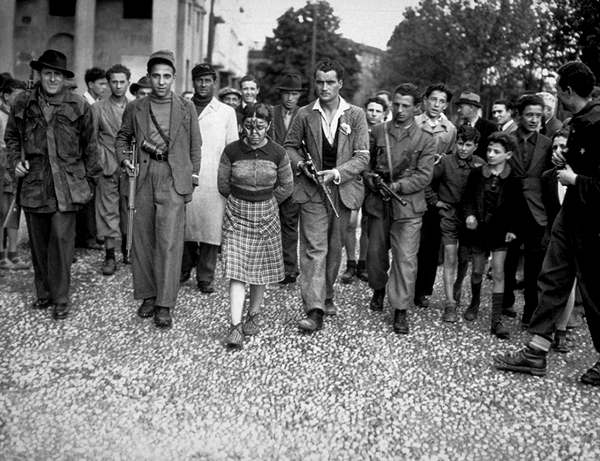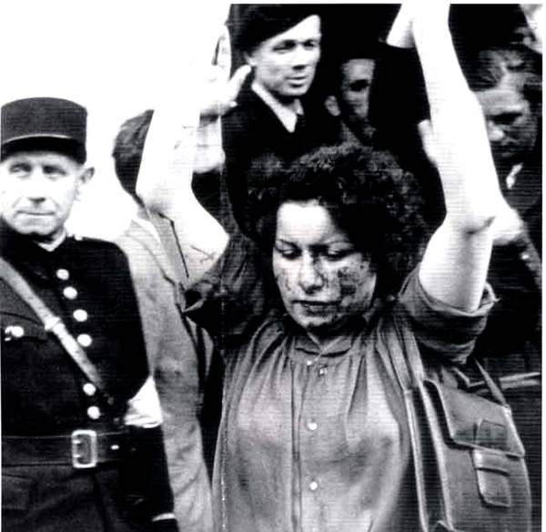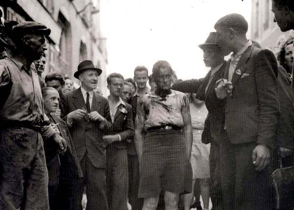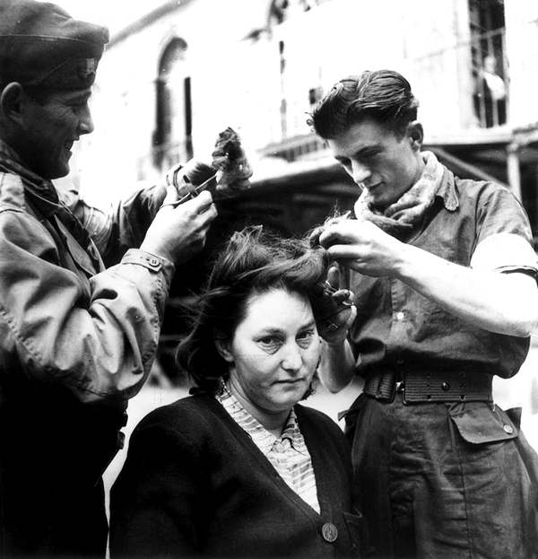 Очевидец тех событий: «Мимо нас, под аккомпанемент ругани и угроз, медленно ехал открытый грузовик. В кузове было около дюжины женщин, все — с обритыми наголо головами, низко опущенными от стыда». Кадры хроники — олицетворением этих слов.