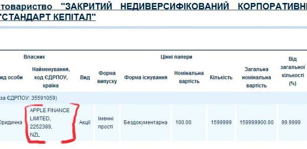 А еще одна новозеландская компания Apple Finance Limited - тоже детище Яна Тейлора, была основателем украинским ПАО ЗНКИФ «Стандарт Капитал», которое связано с Фондом «Доминанта».