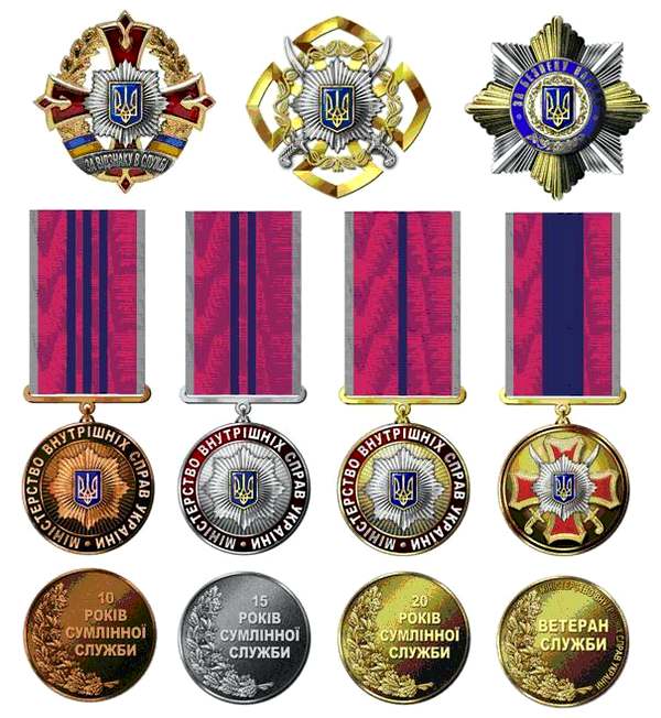 Также переформатировало свою наградную систему МВД (приказ от 18.01.2013 г. № 38). Теперь они имеют таких «слонов»: Благодарность; Грамота; Почетная грамота; нагрудный знак «За отличие в службе»; нагрудный знак «За отвагу в службе»; нагрудный знак «За безопасность народа»; медаль «10 лет добросовестной службы»; медаль «15 лет добросовестной службы»; медаль «20 лет добросовестной службы»; медаль «Ветеран службы».