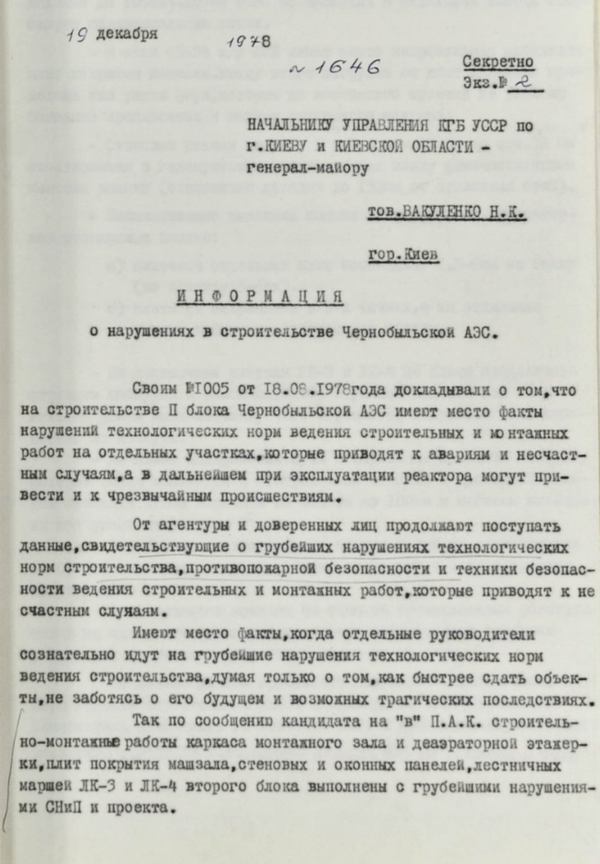Радянський Комітет держбезпеки (КДБ) попереджав про можливість катастрофи в Чорнобилі ще за вісім років до аварії. У грудні 1978 року начальник районного відділу КДБ капітан Клочко склав доповідну «Про порушення в будівництві Чорнобильської АЕС». У ній він писав, що «окремі керівники йдуть на грубі порушення технологічних норм ведення будівництва, думаючи лише про те, як швидше здати об'єкти, не піклуючись про його майбутнє та можливі трагічні наслідки».