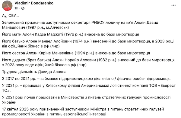 Найближчі рідні новопризначеного заступника секретаря РНБО Давида Алояна внесені до бази "Миротворець".